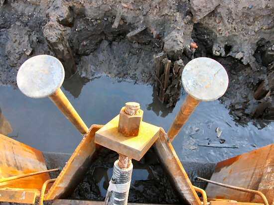 | 05.01.2005 - Nordhafen: Abriss Spannbetonkaiplatte und Neubau Tagesliegerhafen Bei jedem GEWI-Pfahl sitzen zwei solcher Telleranker. Diese sind erst angeheftet und müssen noch fester mit der Spundwand verschweißt werden. |