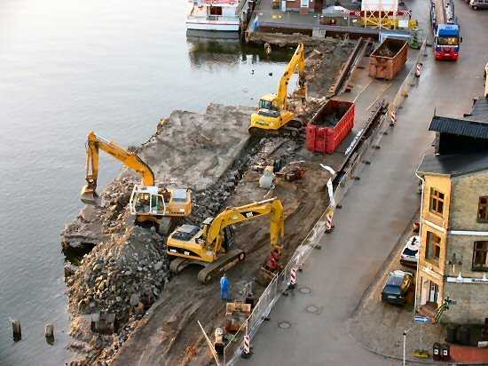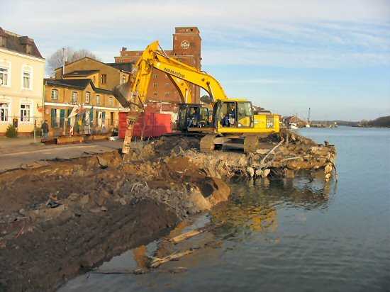 | 07.01.2005 - Nordhafen: Abriss Spannbetonkaiplatte und Neubau Tagesliegerhafen Blick auf das Südende des zukünftigen Tagesliegerhafens. Ein Bagger wurde heute bereits abgezogen, da es für drei Bagger zu eng wurde, |