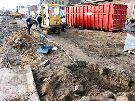 | 05.01.2005 - Nordhafen: Abriss Spannbetonkaiplatte und Neubau Tagesliegerhafen Auch die Telekom ist heute auf der Baustelle, um ein Telefonkabel zu reparieren. Dieses ragte auf einer Länge von ca. 4 m aus dem Boden heraus. Kein Mensch wusste um was für ein Kabel es sich hier handelte. |