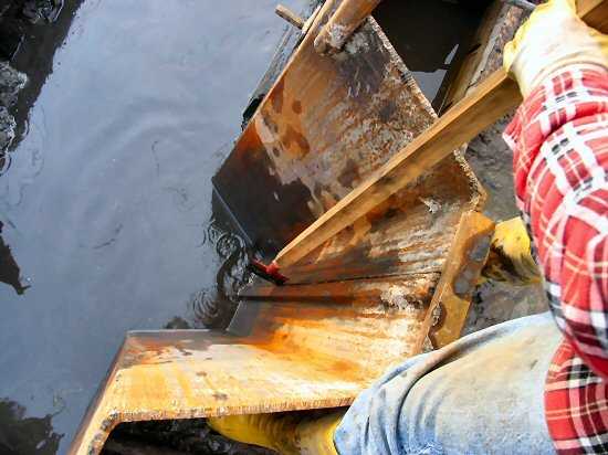 | 04.01.2005 - Nordhafen: Abriss Spannbetonkaiplatte und Neubau Tagesliegerhafen Polier Dieter Ehlers entfernt bei einer Bohle mit einer Schaufel den Schlamm, damit an dieser Stelle ein trapezförmiges Betonteil eingehängt werden kann. |