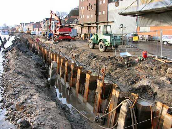 | 07.01.2005 - Nordhafen: Abriss Spannbetonkaiplatte und Neubau Tagesliegerhafen Blick auf die Längsspundwand (Nord-Süd-Richtung). Rechts im Bild lagern die Bohlen für die nördliche Querspundwand. |
