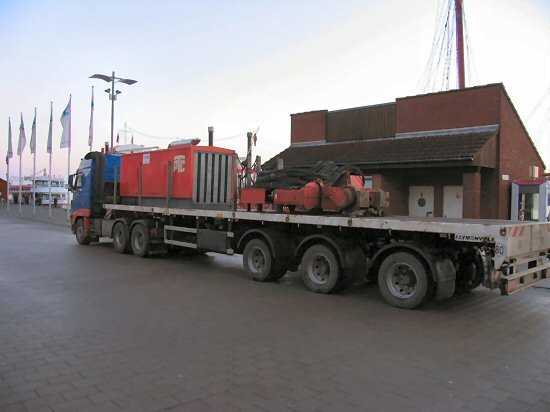 | 06.01.2005 - Nordhafen: Abriss Spannbetonkaiplatte und Neubau Tagesliegerhafen Dieser LKW bringt das Rüttelgeschirr zum Einrütteln der Bohlen für die Querspundwände. |