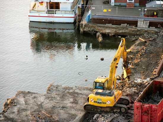 | 06.01.2005 - Nordhafen: Abriss Spannbetonkaiplatte und Neubau Tagesliegerhafen Blick auf die Position der ehemaligen Pierplatte 6. Von dieser ist nur noch ein kleines Reststück (links vom Bagger) übrig. |
