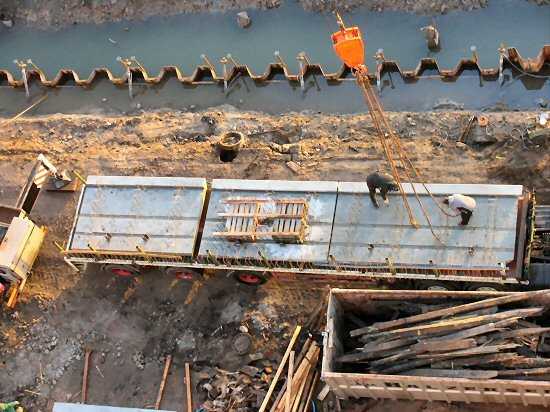 | 06.01.2005 - Nordhafen: Abriss Spannbetonkaiplatte und Neubau Tagesliegerhafen Die Platte wird mit Hilfe von Hölzern auf die erste bereits abgeladene Platte gelegt. Die Gräben vor und hinter der Spundwand sind heute voll mit Wasser gefüllt. |