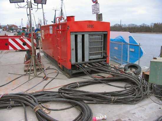 | 07.01.2005 - Nordhafen: Abriss Spannbetonkaiplatte und Neubau Tagesliegerhafen Das Hydraulikaggregat für den Rüttler. Alle Schläuche sind bereits angeschlossen. |