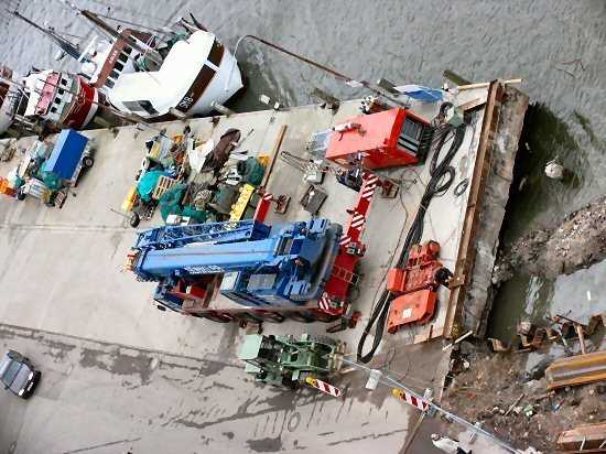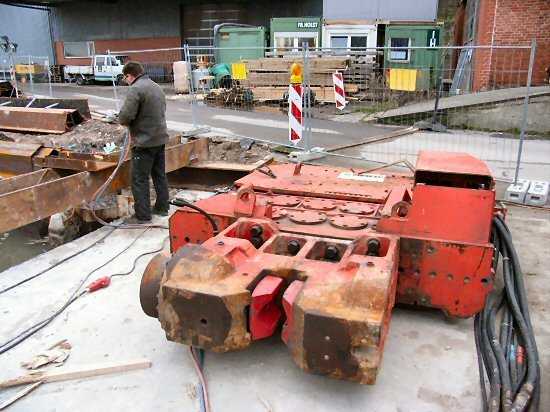 | 07.01.2005 - Nordhafen: Abriss Spannbetonkaiplatte und Neubau Tagesliegerhafen Der Rüttler hängt später am Kranhaken. Mit seinem Maul" (vorne) hält der Rüttler später die Bohlen beim Einrütteln fest. |