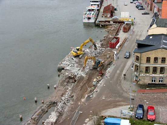| 06.01.2005 - Nordhafen: Abriss Spannbetonkaiplatte und Neubau Tagesliegerhafen Blick von oben auf Kappeln. Links ist der südliche Teil der Baustelle zu erkennen. |