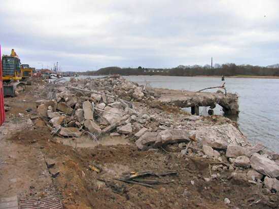 | 07.01.2005 - Nordhafen: Abriss Spannbetonkaiplatte und Neubau Tagesliegerhafen Blick auf die Reste der Pierplatte 5 |