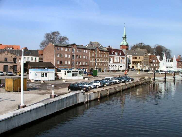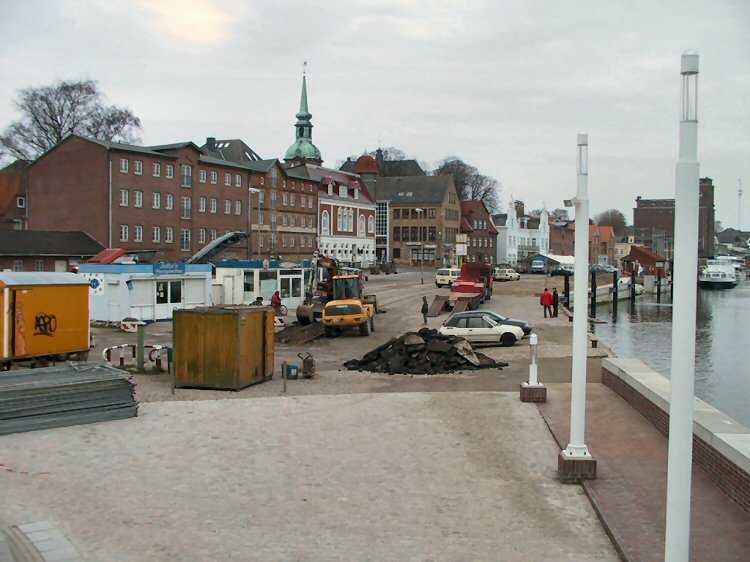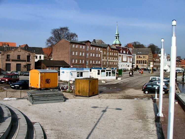 | 27.02.2005 - Das Hafenvorfeld vor einem Jahr und heute. Foto: 01.03.2004 Blick von der neuen Schleibrücke auf das Hafenvorfeld zwischen dem Hohlweg und dem Fährberg. Am 1. März 2004 begannen die Bauarbeiten zur Umgestaltung des Hafenvorfeldes. |