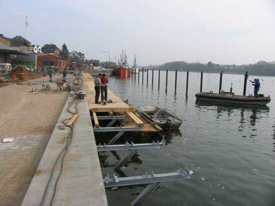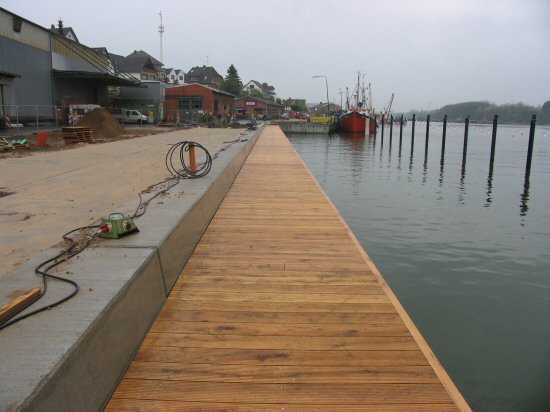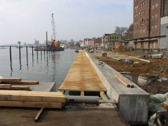 | 03.05.2005 - Nordhafen: Neubau Tagesliegerhafen und Instandsetzung des Kaiabschnittes 4 Blick von Norden auf den Tagesliegerhafen. Der Brückensteg wird noch zum Wasser hin durch einen schmalen Holzbalken abgeschlossen. |