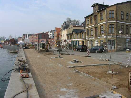 | 02.05.2005 - Nordhafen: Neubau Tagesliegerhafen und Instandsetzung des Kaiabschnittes 4 Blick auf den Pflasterbereich in Höhe des Dehnthofes. Rechts muss noch Ecke gepflastert werden. |