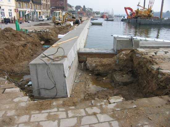 | 02.05.2005 - Nordhafen: Neubau Tagesliegerhafen und Instandsetzung des Kaiabschnittes 4 Blick von Norden auf den zukünftigen Tagesliegerhafen. Der Brückenbelag wurde hier schon zum Wasser hin gerade abgesägt. |