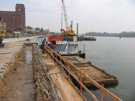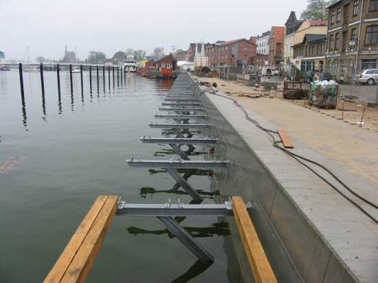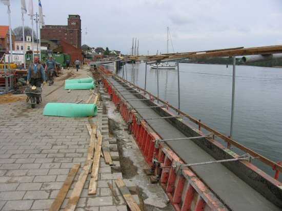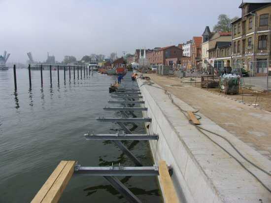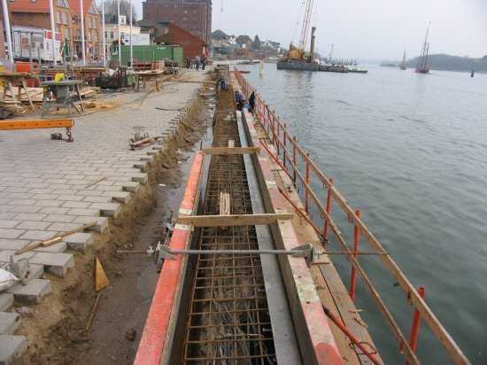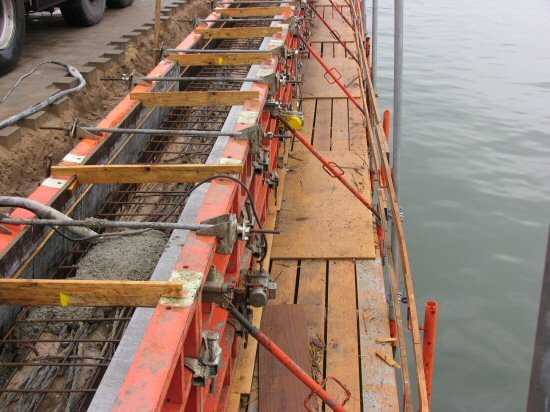 | 04.05.2005 - Nordhafen: Neubau Tagesliegerhafen und Instandsetzung des Kaiabschnittes 4 An der wasserseitigen Schalung sind Rüttelmotoren angebaut. Mit diesen wird der Beton in diesem Bereich verdichtet. |