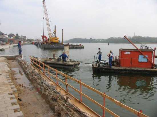 | 02.05.2005 - Nordhafen: Neubau Tagesliegerhafen und Instandsetzung des Kaiabschnittes 4 Wegen dem Richtseil für das Einrütteln der Festmacherpfähle muss Horst Bähr einen Arbeitsponton für die Montage der Brückenträger durch eine kleine Öffnung im Süden bugsieren. |