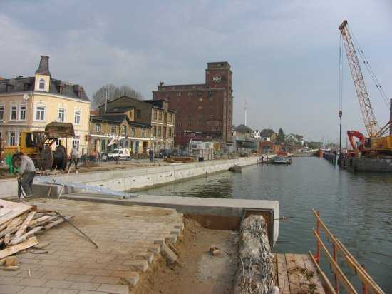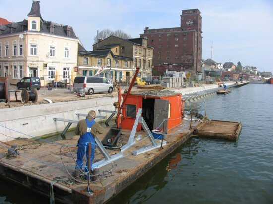 | 04.05.2005 - Nordhafen: Neubau Tagesliegerhafen und Instandsetzung des Kaiabschnittes 4 Horst Bähr von der Firma Ostseedienst hat gerade den Arbeitsponton abgeschleppt. Jetzt kann man das Hafenbecken des Tagesliegerhafens auch von Süden aus schön erkennen. |