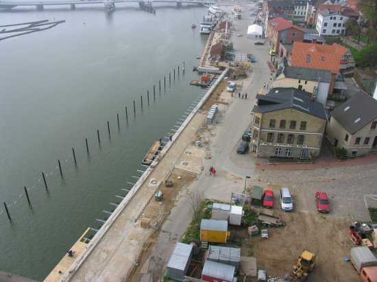 | 03.05.2005 - Nordhafen: Neubau Tagesliegerhafen und Instandsetzung des Kaiabschnittes 4 Blick von oben aus dem GAG-Silo auf das südliche Ende des Tagesliegerhafen. Alle Festmacherpfähle sind jetzt in den Schleigrund eingerüttelt. |