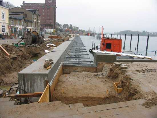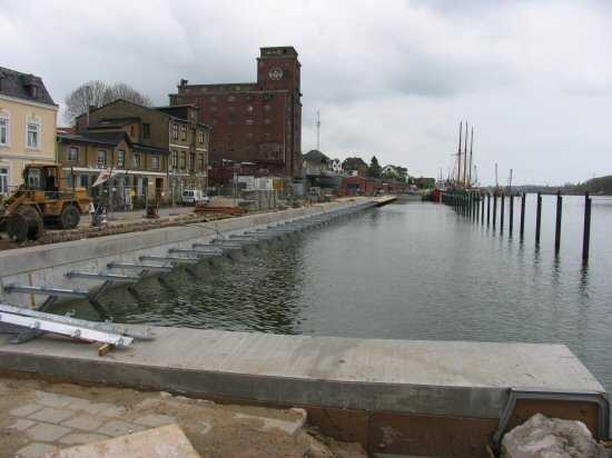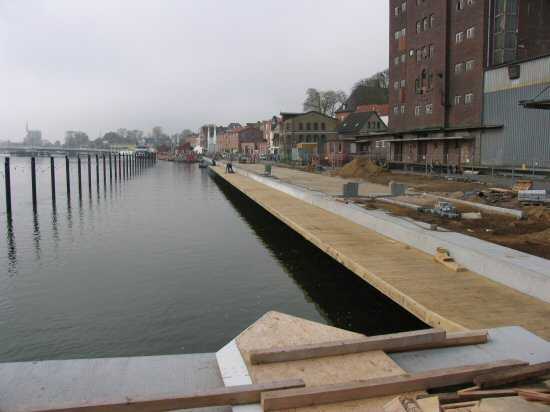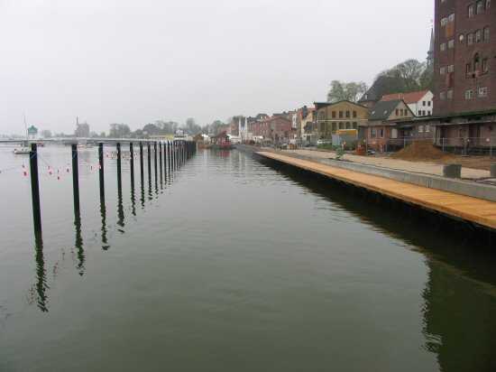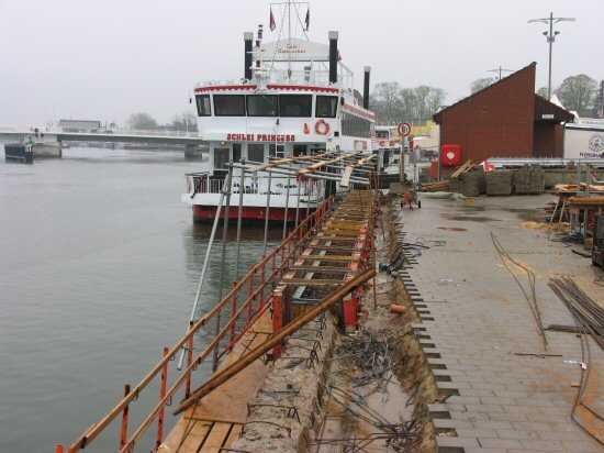 | 04.05.2005 - Nordhafen: Neubau Tagesliegerhafen und Instandsetzung des Kaiabschnittes 4 Blick von Norden auf den Tagesliegerhafen. Es ist fast windstill und es regnet leicht in Kappeln. Momentan hat der Regen eine Pause eingelegt. |