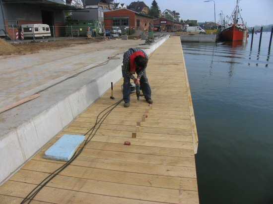 | 03.05.2005 - Nordhafen: Neubau Tagesliegerhafen und Instandsetzung des Kaiabschnittes 4 Hier kann man den wasserseitigen schmalen Holzbalken gut erkennen. Dieser Balken dient praktisch als Holzfender (Stoßschutz) für die Brücke. |