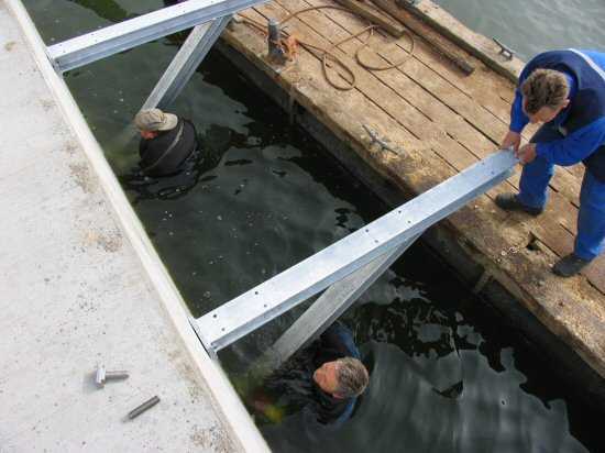 | 03.05.2005 - Nordhafen: Neubau Tagesliegerhafen und Instandsetzung des Kaiabschnittes 4 Unter der Wasseroberfläche müssen Taucher die Stützen verschrauben. Hier genügt nur ein Neoprenanzug ohne Taucherhelm. |