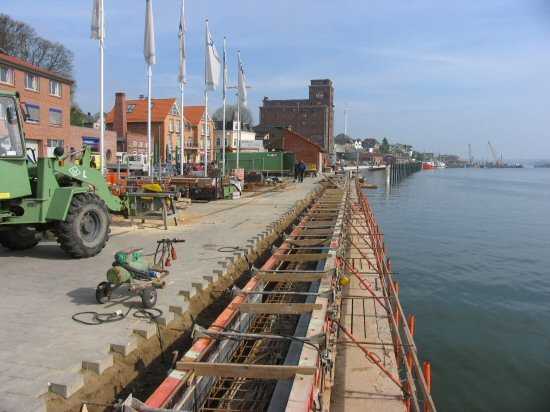 | 03.05.2005 - Nordhafen: Neubau Tagesliegerhafen und Instandsetzung des Kaiabschnittes 4 Blick von Süden auf die Schalung der Blöcke 1 und 2 vom Kaiabschnitt 4. Dies beiden Blöcke sollen morgen bereits betoniert werden. |