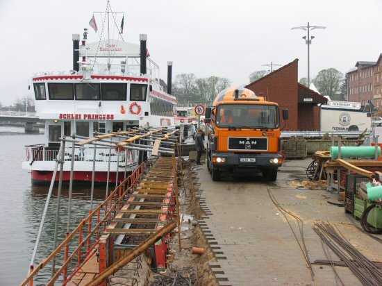 | 04.05.2005 - Nordhafen: Neubau Tagesliegerhafen und Instandsetzung des Kaiabschnittes 4 Das Transportfahrzeug wird parallel zu den Blöcken 1 und 2 fahren. Der Beton wird über eine Rutsche in die Schalung eingeleitet. |