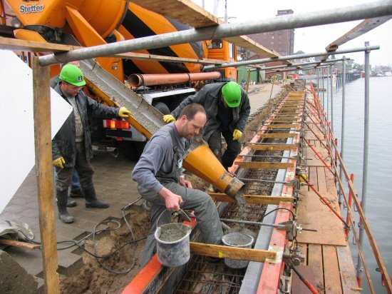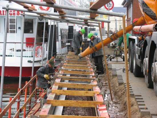 | 04.05.2005 - Nordhafen: Neubau Tagesliegerhafen und Instandsetzung des Kaiabschnittes 4 Das Betonieren der Blöcke 1 und 2 hat begonnen. Im oberen Bereich wird der Beton mit einem normalen Rüttler verdichtet. |