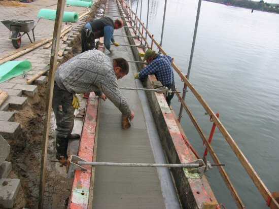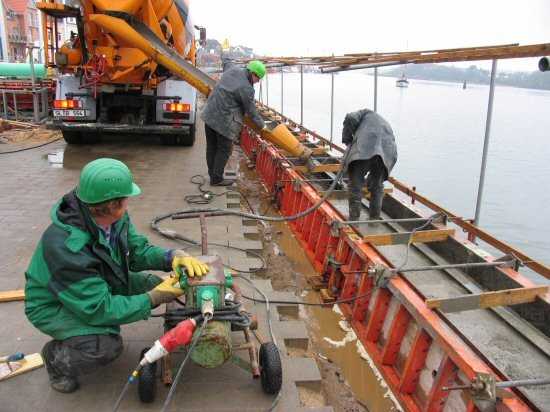| 04.05.2005 - Nordhafen: Neubau Tagesliegerhafen und Instandsetzung des Kaiabschnittes 4 Blick von Norden auf die Betonierung der Blöcke 1 und 2 des Kaiabschnittes 4. Ronny Wendt (links) muss die Rüttelmotoren je nach Betonierfortschritt umsetzen. |