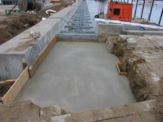 | 04.05.2005 - Nordhafen: Neubau Tagesliegerhafen und Instandsetzung des Kaiabschnittes 4 Auch die Blöcke 1 und 2 des Kaiabschnittes 4 sind fertig betoniert. Jetzt muss nur noch die Oberfläche geglättet und die Besenstrichstruktur aufgebracht werden. |