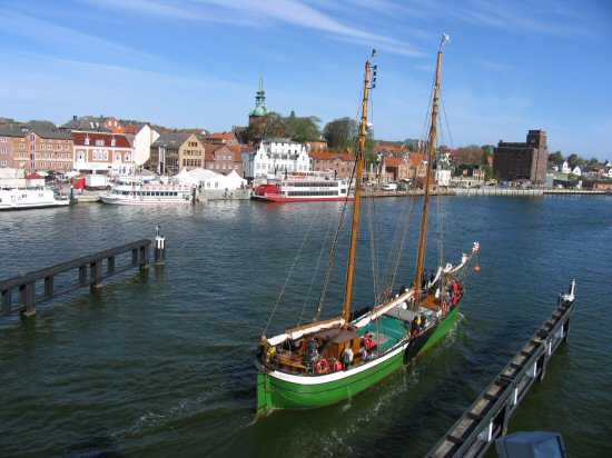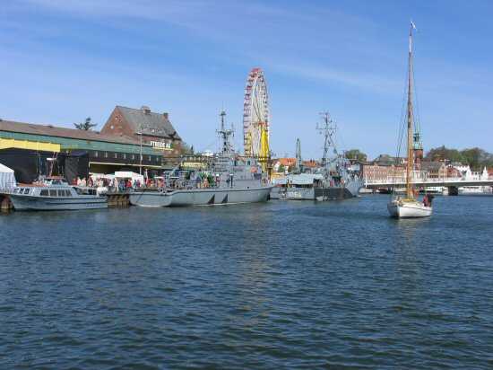 | 05.05.2005 - 27. Heringstage Kappeln vom 05.05. bis 08.05.2005 Blick von der Brücke auf das Geschehen im Nordhafen. Der Rettungskreuzer NIS RANDERS hat seinen Noteinsatz beendet und kehrt gerade nach Kappeln zurück. Das Boot kann ebenso wie die Marineboote besichtigt werden. |