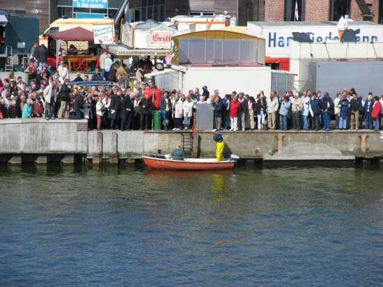 | 05.05.2005 - 27. Heringstage Kappeln vom 05.05. bis 08.05.2005 Jetzt geht es mit den Heringen im Boot rüber zum Nordhafen, damit die Prominenten das Gewicht der gefangenen Heringe schätzen können. |