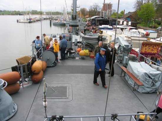 | 07.05.2005 - 27. Heringstage Kappeln vom 05.05. bis 08.05.2005 Blick auf das hintere Aufbaudeck der GRÖMITZ. Besucher erklimmen das Deck über einen schmalen Niedergang (links). |
