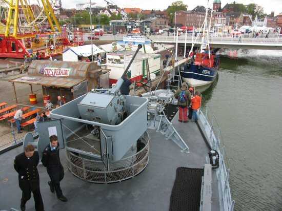 | 07.05.2005 - 27. Heringstage Kappeln vom 05.05. bis 08.05.2005 Blick von der Brücke auf das Vorschiff oder auch Back der GRÖMITZ. Als Flugabwehrgeschütz steht eine 40mm-Kanone zur Verfügung. |