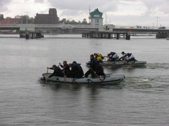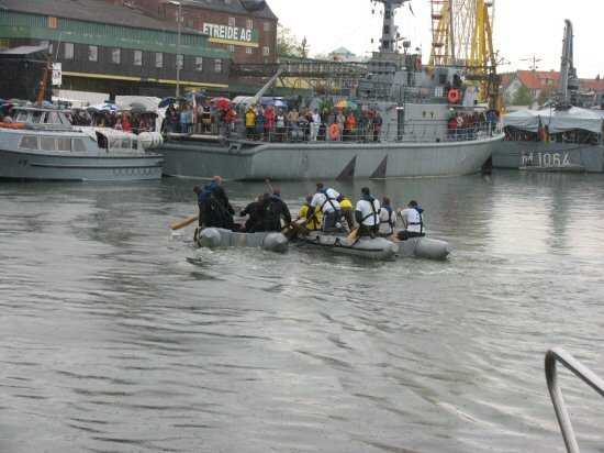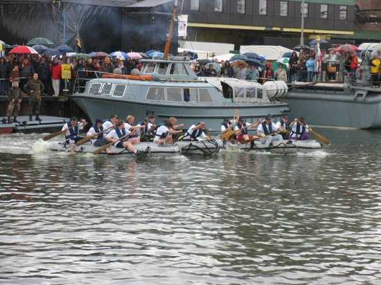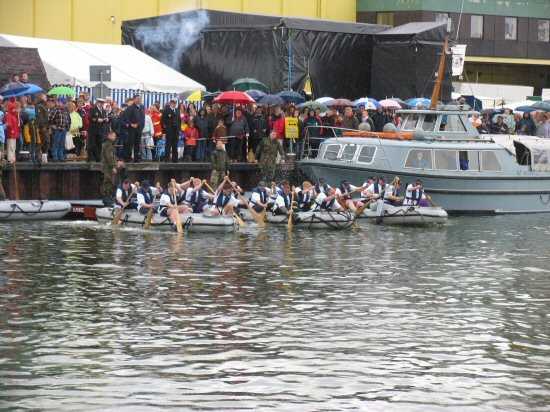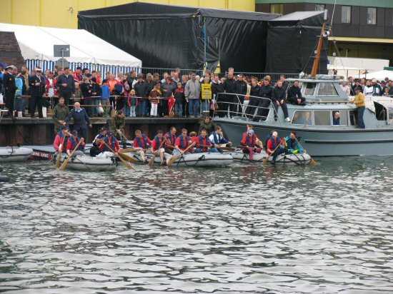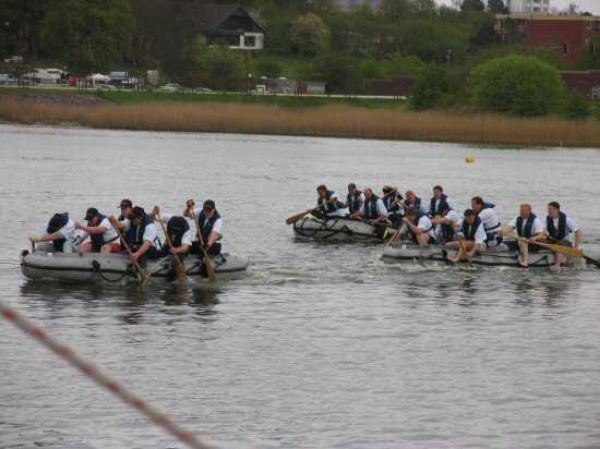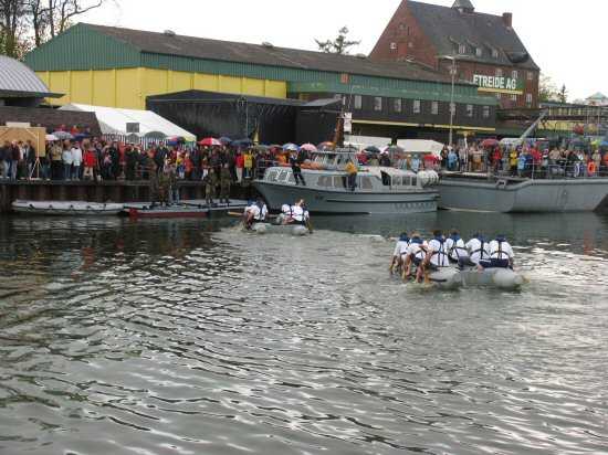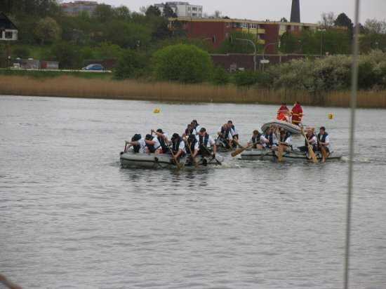 | 07.05.2005 - 27. Heringstage Kappeln vom 05.05. bis 08.05.2005 Der 1. Vorlauf des Schlauchbootrennens wird gleich gestartet. In der Mitte die Schliejungs" der spätere Sieger des Endlaufes. |