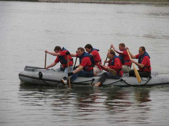 | 07.05.2005 - 27. Heringstage Kappeln vom 05.05. bis 08.05.2005 Die Mannschaften für den 3. Vorlauf bereiten sich vor. Es werden gerade die Schwimmwesten angelegt. |