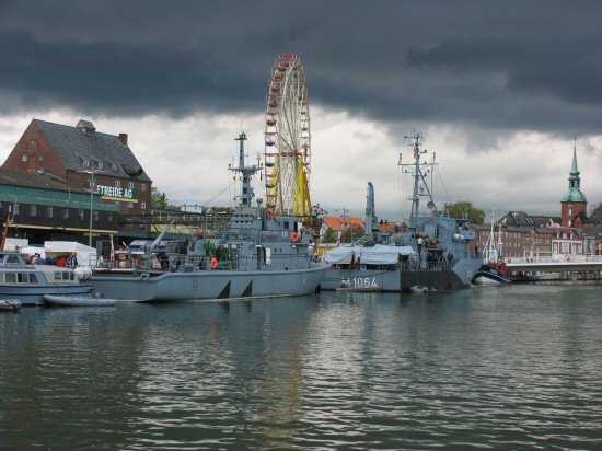 | 05.05.2005 - 27. Heringstage Kappeln vom 05.05. bis 08.05.2005 9:45 Uhr die Brücke wird gerade geöffnet und gibt den Blick auf den Südhafen frei. Es haben dort festgemacht das polnische Minensuchboot NECKO (links) und das deutsche Minenjagdboot GRÖMITZ (noch aus Olpenitz). |