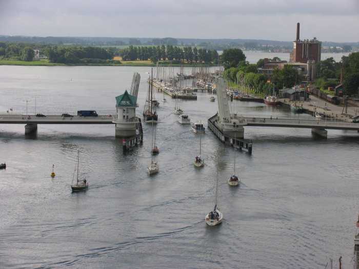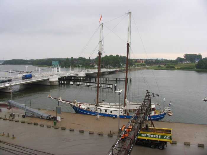 | 01.08.2005 - 9:52 Uhr - Kappeln/Schlei: Schleibrücke Pünktlich um 9:45 Uhr wurden die Klappen der Schleibrücke geöffnet, damit die auf beiden Seiten wartenden Boote die Brücke passieren können. Jetzt im Sommer wird fast stündlich von 5:45 Uhr bis 21:45 Uhr die Brücke geöffnet. Das Wetter ist durchwachsen. Gerade schien noch die Sonne. Jetzt fängt es wieder leicht an zu regnen. Foto: Eckhard Schmidt - Kappeln - (C) 2005 |