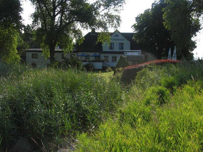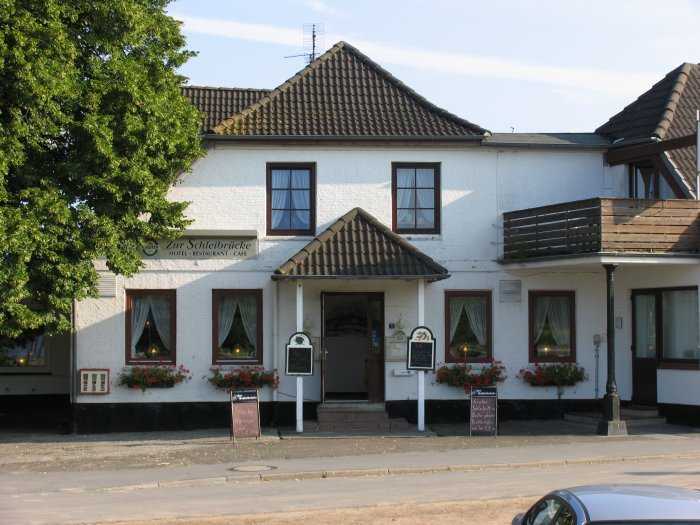 | 03.08.2005 - 8:36 Uhr - Kappeln/Schlei: Ellenberg Zur Schleibrücke" Hotel - Restaurant - Café gesehen von der Schlei aus. Früher bis zum Jahre 1867 war dies das Fährhaus von Ellenberg. Foto: Eckhard Schmidt - Kappeln - (C) 2005 |