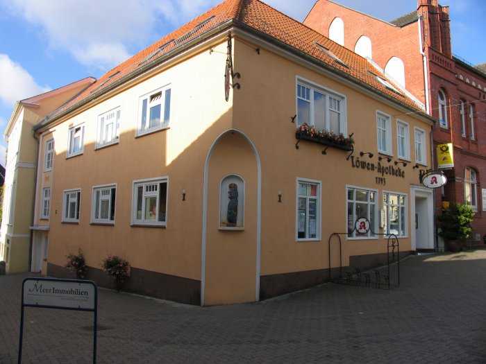 | 04.08.2005 - 8:41 Uhr - Kappeln/Schlei: Poststraße 2 Das Bild zeigt die Löwen-Apotheke. Sie ist die älteste der vier Apotheken in Kappeln. Die Apotheke besteht schon seit 1793. Namensgeber der Apotheke ist eine kleine Holzfigur, welche einen Löwen darstellt. Die Figur ist in einer kleinen Nische an der Nordostecke der Apotheke aufgestellt. (Siehe Mitte des Bildes) Die Inschrift auf der Rückseite des Löwen lautet: DER HERR BEHÜT DIES HAUS + DIE DA GEHENDEN EIN UND AUS" Weitere Informationen (Historie) zur Apotheke siehe: www.loewen-apotheke-kappeln.de Informationen zur Apotheker-Familie siehe: Flaschenpost aus dem Jahre 1869" Die anderen drei Apotheken von Kappeln finden sie unter den Adressen: Adler-Apotheke, Schmiedestraße 28, Dehnthof-Apotheke, Dehnthof 9 Schlei-Apotheke, Sylter Straße 3 (Ellenberg) Foto: Eckhard Schmidt - Kappeln - (C) 2005 |