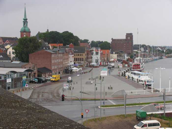 | 05.08.2005 - 9:12 Uhr - Kappeln/Schlei: Nordhafen Blick aus dem GAG-Silo im Südhafen auf den Nordhafen. Heute am frühen Morgen hat hier in Kappeln noch die Sonne geschienen. Jetzt hat der Regen von Westen kommend Kappeln erreicht. Foto: Eckhard Schmidt - Kappeln - (C) 2005 |