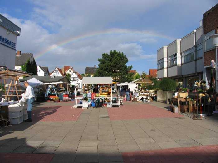 | 06.08.2005 - 8:35 Uhr - Kappeln/Schlei: Deekelsenplatz Auf dem Deekelsenplatz (hinter der Nord-Ostsee-Sparkasse) findet heute und morgen der traditionelle Töpfer- und Keramikmarkt statt. Die Aussteller sind gerade dabei ihre Stände aufzubauen. Das Wetter soll heute wieder wechselhaft werden. Im Westen ist ein Regenbogen am Himmel zu erkennen. Gleich nach dieser Aufnahme fing es leicht zu regnen an. Foto: Eckhard Schmidt - Kappeln - (C) 2005 |