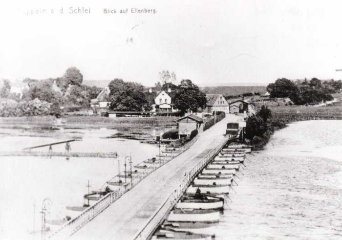 | Vor 1914 (geschätzt) - Kappeln/Schlei: Ellenberg Blick von Kappeln auf Ellenberg. Links von der Pontonbrücke ist zwischen zwei großen Bäumen in der Mitte des Bildes das frühere Fährhaus von Ellenberg zu erkennen. Das Gebäude steht heute noch und beherbergt das Hotel - Restaurant - Café Zur Schleibrücke". Zu den Themen Fähren, Pontonbrücke und Drehbrücke sind von unserem Stadtarchivar Hans-Peter Wengel auf der Webseite der Stadt Kappeln - Stadtarchiv folgende Beiträge (interne Links - PDF-Dateien) veröffentlicht worden: Die Fähren über die Schlei in Kappeln Das Fährhaus in Ellenberg Die Pontonbrücke und die Eckernförder-Kappelner Schmalspurbahn. Die Pontonbrücke über die Schlei in Kappeln Die "neue" Drehbrücke über die Schlei in Kappeln Foto: Stadtarchiv - Kappeln |