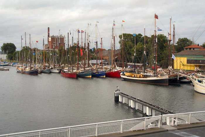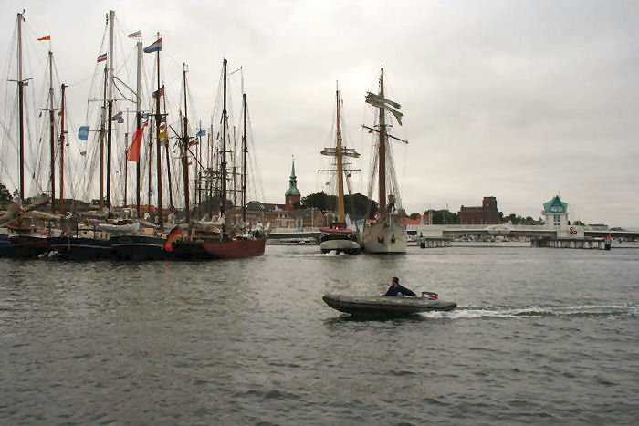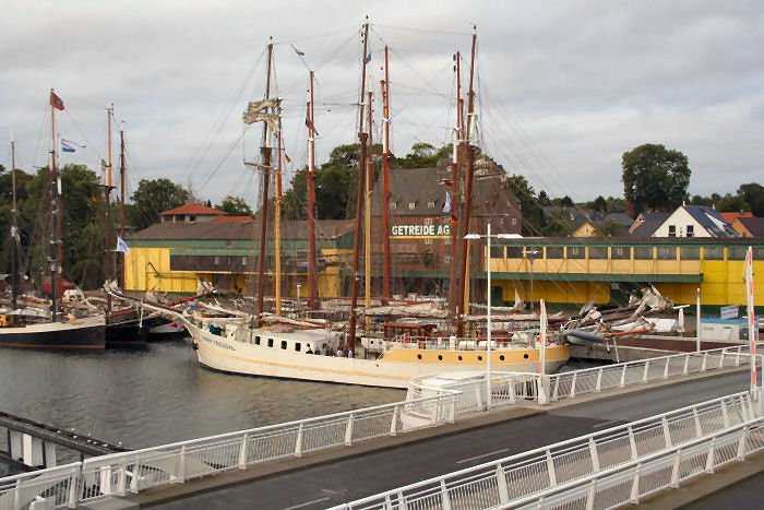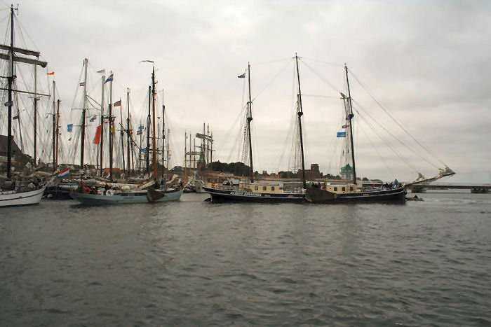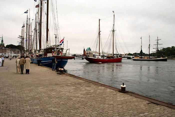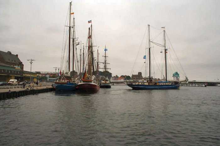 | 11.09.2005 - 9:28 Uhr - Kappeln/Schlei: Südhafen Tiessen-Race 2005 Auslaufen der Traditionssegler der ersten Gruppe -> Brückenpassage 9:45 Uhr. Die Traditionssegler verlassen Kappeln in zwei Gruppen, um die Brückenöffnung so kurz wie möglich zu halten. Die erste Gruppe (10 Segler) passiert die Brücke um 9:45 Uhr und die zweite Gruppe um 10:45 Uhr. Die ersten Segler der ersten Segler legen bereits ab. Einige Segler müssen noch ihren Anker heben. |