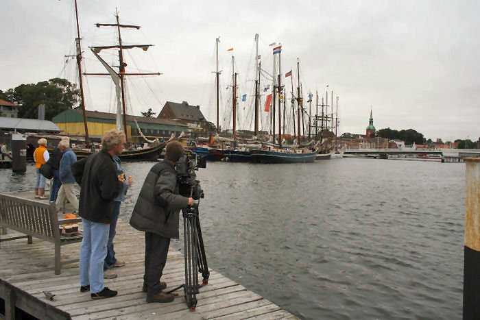 | 11.09.2005 - 9:41 Uhr - Kappeln/Schlei: Südhafen Tiessen-Race 2005 Auslaufen der Traditionssegler der ersten Gruppe -> Brückenpassage 9:45 Uhr. Ein Kamerateam vom Landarzt" hat sich auch eingefunden, um einigen Szenen im Bild festzuhalten. Die erste Gruppe von Traditionsseglern hat das Ablegemanöver fast beendet. Es sind ja auch nur noch einige Minuten bis zur Brückenöffnung. |