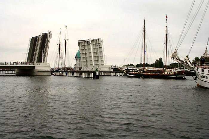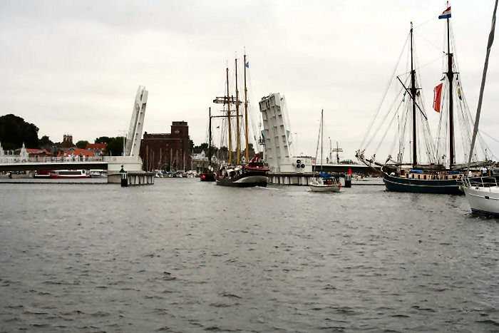 | 11.09.2005 - 9:50 Uhr - Kappeln/Schlei: Südhafen Tiessen-Race 2005 Auslaufen der Traditionssegler der ersten Gruppe -> Brückenpassage 9:45 Uhr. Die Brücke hat jetzt alle vier Klappen geöffnet. Die Mare Frisium" in Richtung Schleibrücke. |
