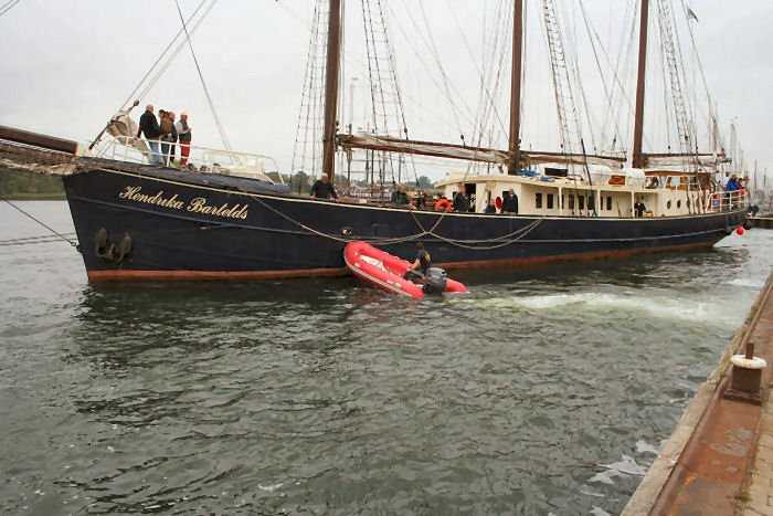 | 11.09.2005 - 10:51 Uhr - Kappeln/Schlei: Südhafen Tiessen-Race 2005 Auslaufen der Traditionssegler der zweiten Gruppe -> Brückenpassage 10:45 Uhr. Die Hendrika Bartelds" braucht noch etwas Unterstützung durch das Schlauchboot, um von der Pier frei zu kommen. Damit ist das Tiessen-Race 2005 für Kappeln beendet. |
