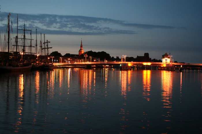 | 08.09.2005 - 20:44 Uhr - Kappeln/Schlei: Südhafen - Schleibrücke Blick von Süden auf die Schleibrücke in ihrer gesamten Länge. Links der Südhafen mit den Traditionsseglern. Blende: 5,00 --- Belichtungszeit: 3,2 s --- ISO-Wert: 200 --- Brennweite: 18 mm Real |