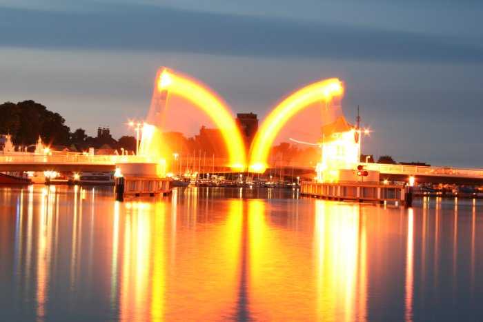 | 08.09.2005 - 20:48 Uhr - Kappeln/Schlei: Südhafen - Schleibrücke Die Schleibrücke öffnet ihre vier Klappen, um einen Traditionssegler passieren zulassen. Blende: 16,00 --- Belichtungszeit: 111 s --- ISO-Wert: 200 --- Brennweite: 55 mm Real |