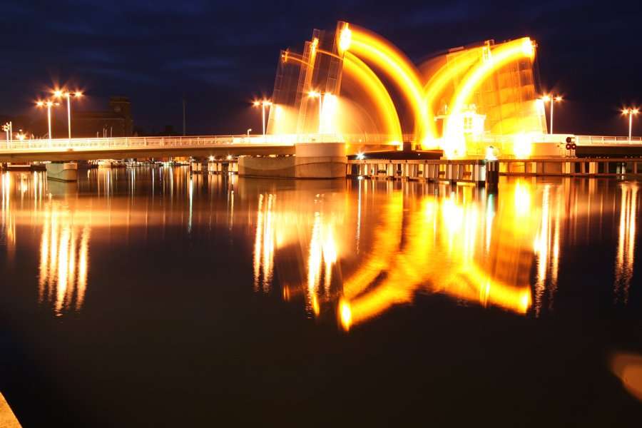 | 03.10.2005 - 19:48:28 Uhr - Kappeln/Schlei: Schleibrücke Aufnahme: Öffnen der Brückenklappen Ich habe Glück auf der Nordseite wartet ein Segelboot auf die Brückenöffnung. Jetzt ist es trocken und auch kein Regen in Sicht. Es ist ganz windstill. Die Wasseroberfläche ist daher spiegelglatt. Ideale Bedingungen für eine Langzeitbelichtung. Die Pier des Südhafens ist heute weniger belegt. Ich kann wieder etwas mehr Abstand von der Brücke halten. Solche Aufnahmen sind immer wieder spannend. Wie wird das Bild ? Ich habe ja nur noch die Möglichkeit die Blende zu verändern. Ich habe diesmal die etwas kleinere Blendenzahl 11 gewählt. Das Bild wurde nicht korrigiert. Links unten im Bild ist ein Stück von der Pier zu erkennen. Der helle Fleck rechts unten rührt wohl von Streulicht her. Mir fehlt für das verwendete Objektiv noch die zugehörige Gegenlichtblende. Bemerkung: Das obige Bild wurde auf eine Größe von 900 x 600 Pixel verkleinert und zusätzlich wie alle anderen Bilder meiner Webseite auch stärker als normal üblich komprimiert. Für Rückvergrößerungen und Ausdrucke ist es weniger geeignet. Für diese Zwecke benötigt man schon das Originalbild. Blende: 11,0 --- Belichtungszeit: 127 s --- ISO-Wert: 100 --- Brennweite: 33 mm Real |