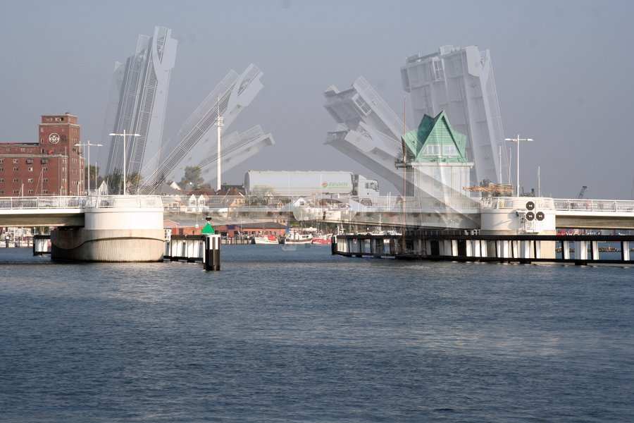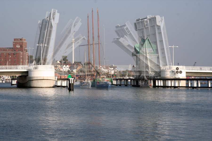 | 08.10.2005 - 10:45 bis 10:49 Uhr - Kappeln/Schlei: Schleibrücke Die Brückenklappen bewegen sich von der Verkehrslage nach der Hochlage. Aus dieser Kameraposition erkennt man die einzelnen Klappen besser. Drei Einzelbilder wurden mit Photoshop übereinander gelegt. Bei den beiden Bilder der oberen Ebene (1 und 2) wurde die Deckkraft auf 50% gesetzt. Durch diese Maßnahme entsteht der Überblend-Effekt. Bild 1 = Hintergrund: Klappen befinden sich in der Verkehrslage. Bild 2 = Ebene 1: Klappen befinden sich in einer Zwischenlage Bild 3 = Ebene 2: Klappen befinden sich in der Hochlage Sportboote passieren in beiden Richtungen die Brücke. Blende: 14,0 --- Belichtungszeit: 1/400 s --- ISO-Wert: 400 --- Brennweite: 70 mm Real |
