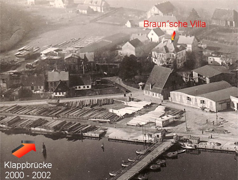 | 15. März 1927 - Kappeln/Schlei: Einweihung der Drehbrücke Verbindung zwischen der Braun´schen Villa und der Löwen-Apotheke? Die Verbindung wurde eine über Flaschenpost aus dem Jahre 1869 hergestellt. Bild 1/7 In dem Bild habe ich den Verlauf der heutigen Klappbrücke (2000 - 2002) mit einem Pfeil angedeutet. Die Braun´sche Villa wurde im Jahre 1987 abgerissen. Der Ausbau der Hospitalstraße begann aber erst 2001. Bei Straßenarbeiten wurde am 27. März 2001 eine Flaschenpost aus dem Jahre 1869" gefunden. Unter dem obigen Link erfahren Sie mehr zu dieser Post". Links von der Pontonbrücke erkennt man den Holzlagerplatz von Konsul Lorentzen. Anlass für diesen Beitrag ist das Kappuzzle 6 von SchulZeitReisen.de Foto (Ausschnitt): Archiv der Stadt Kappeln |